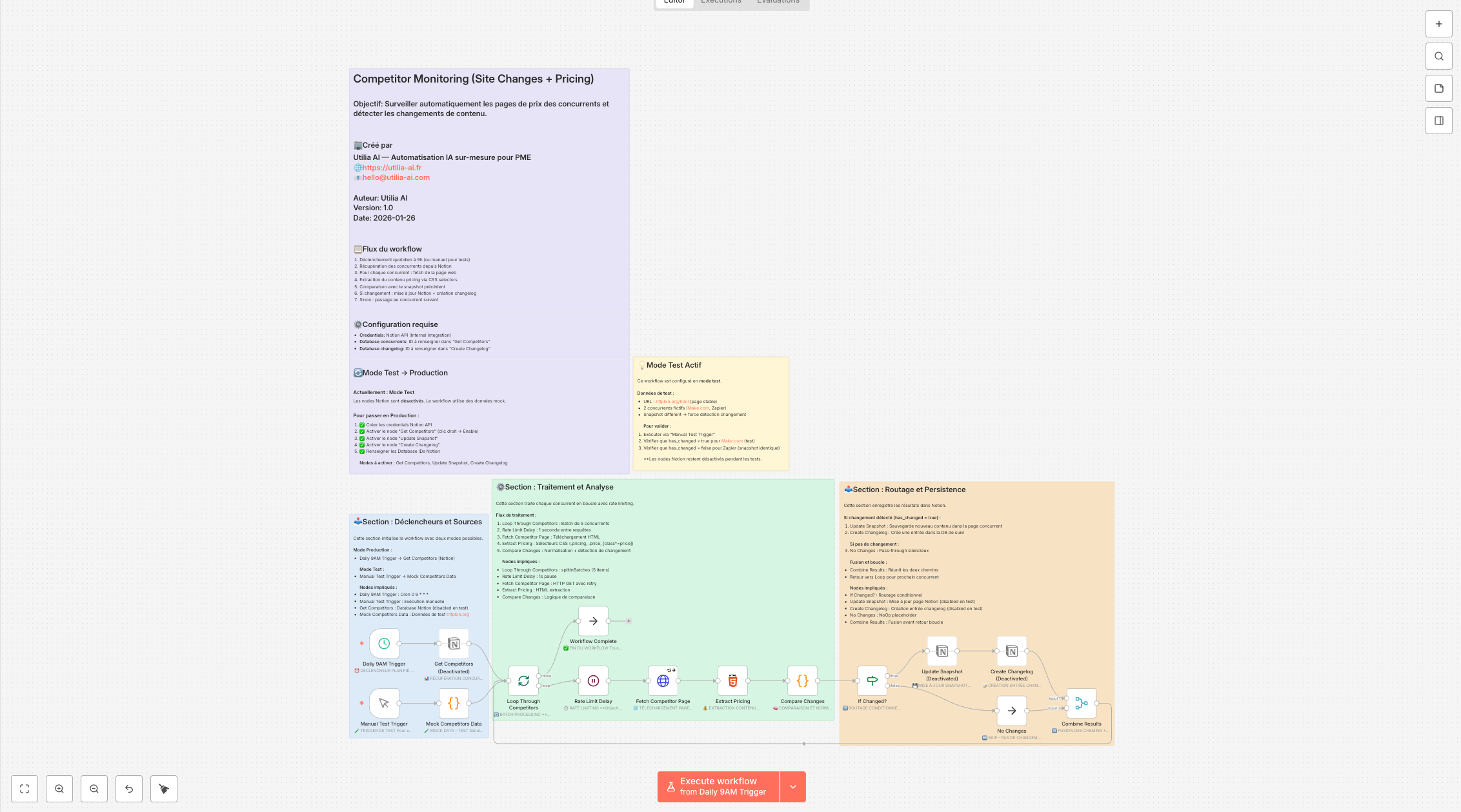 Le workflow est livré en mode test avec des données mock pour valider le fonctionnement sans credentials.